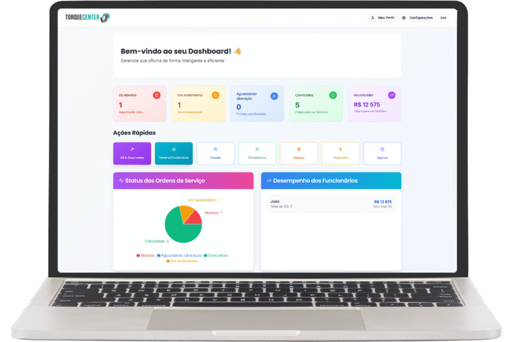Com a TorqueCenter, toda a gestão da sua oficina fica centralizada em um único lugar. Um sistema simples, completo e fácil de usar, criado para dar mais produtividade, organização e confiança em cada etapa do seu trabalho.